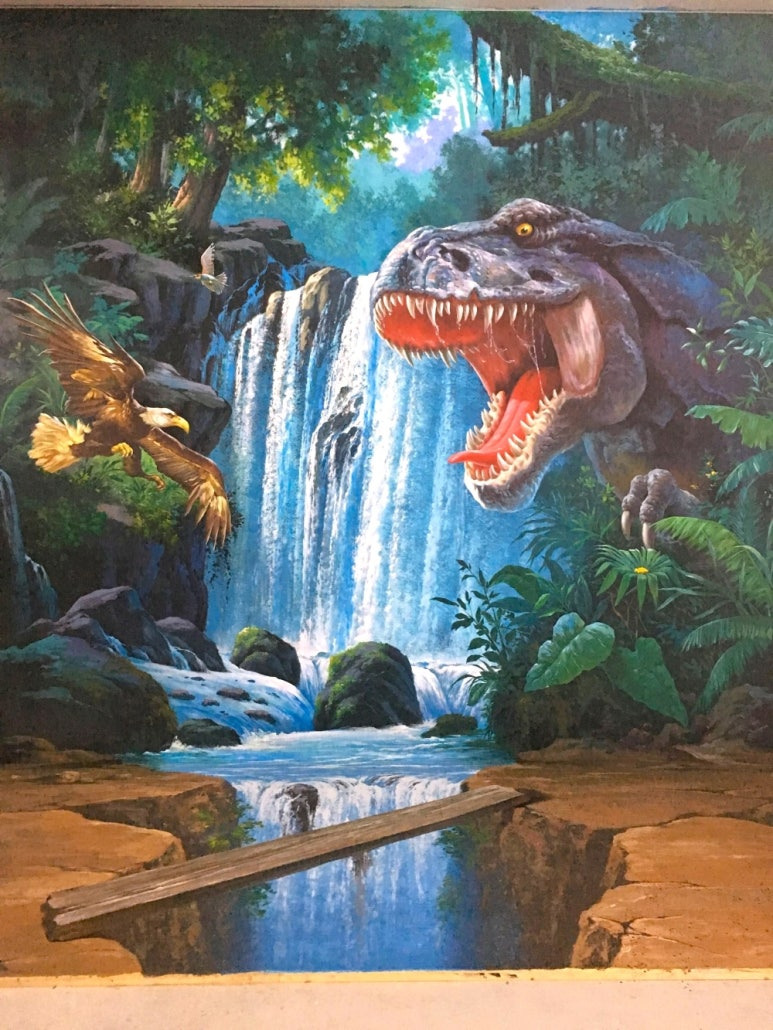 공룡의 요란한 목소리와 쏟아지는 폭포수의